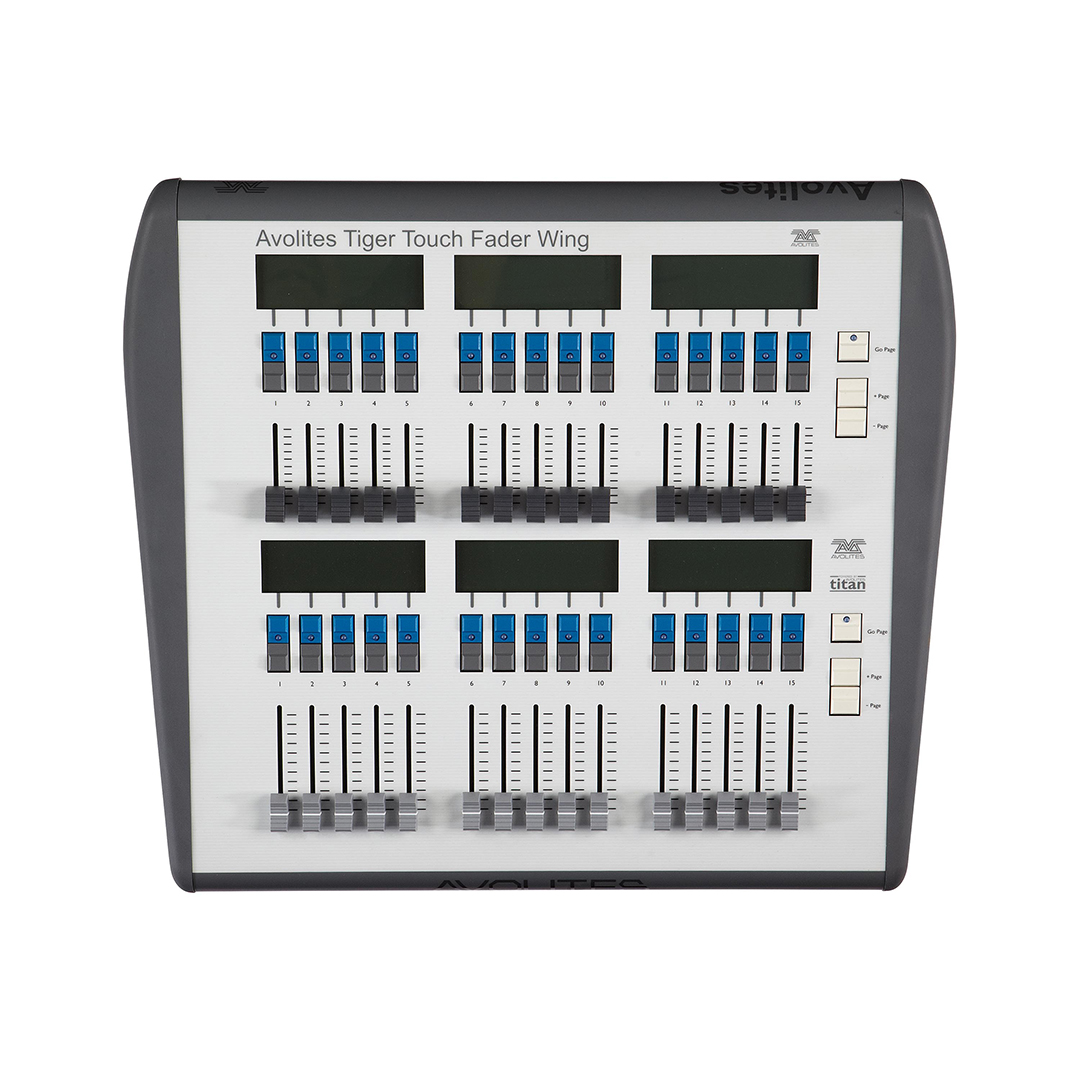 Avolites Tiger Touch Fader Wing biedt 30 extra faders voor directe toegang tot alle playbacks, spots en paletten. Programmeerbare macro knoppen en pagina controle op de wing geven intuitieve bediening van shows van wereldklasse. Elke fader wordt elektronisch gelabelled met een backlit LCD.